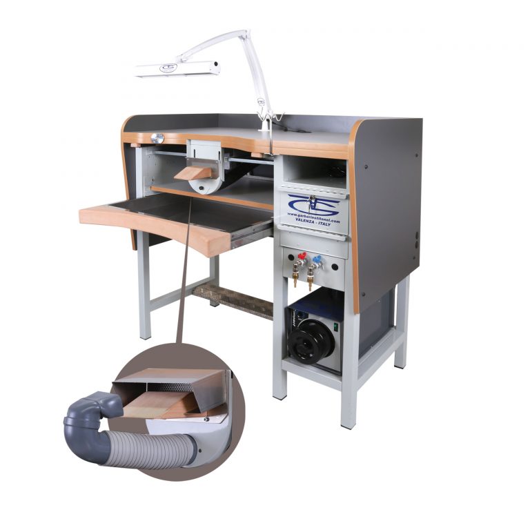 La postazione di lavoro è equipaggiata con aspiratore per le polveri con doppio filtro ciclonico, a recupero immediato, collegato ad una bocchetta di aspirazione regolabile in altezza. Quest’ultima consente di utilizzare un microscopio ( non incluso ) senza perdere i benefici dell’aspirazione. Il sistema di aspirazione è inoltre composto da una bocchetta flessibile e removibile per ribaltare l’aspirazione posteriormente rispetto all’oggetto lavorato, utile soprattutto in caso di utilizzo di trapani o utensili girevoli.