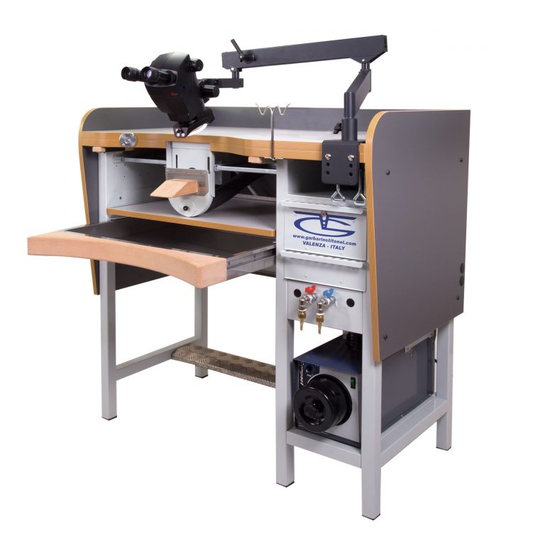 La postazione di lavoro è equipaggiata con aspiratore per le polveri con doppio filtro ciclonico, a recupero immediato, collegato ad una bocchetta di aspirazione regolabile in altezza. Quest’ultima consente di utilizzare un microscopio ( non incluso ) senza perdere i benefici dell’aspirazione. Il sistema di aspirazione è inoltre composto da una bocchetta flessibile e removibile per ribaltare l’aspirazione posteriormente rispetto all’oggetto lavorato, utile soprattutto in caso di utilizzo di trapani o utensili girevoli.