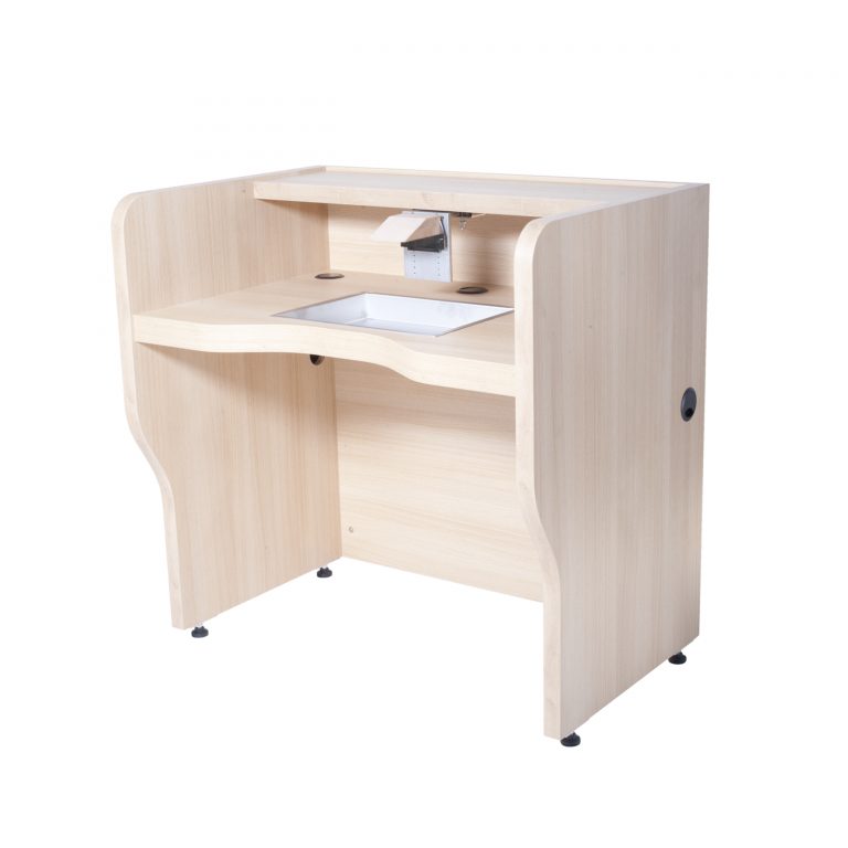 I banchi sono costruiti in acciaio laccato a caldo, rivestiti con pannellature di legno ignifugo, il piano di lavoro è in legno ignifugo rivestito in laminato ed il cassettone di lavoro ha un appoggio anatomico in legno di faggio per migliorare la posizione dell’operatore.